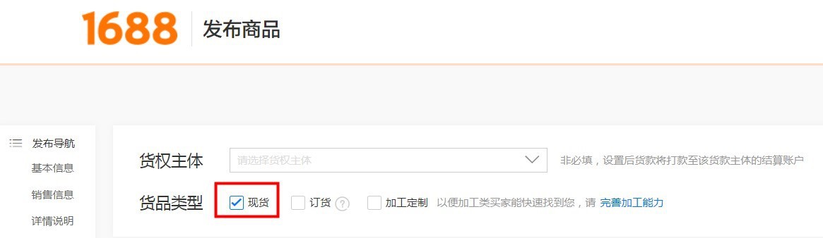 商品發(fā)布頁面貨品類型選擇"現(xiàn)貨"的商品為現(xiàn)貨商品