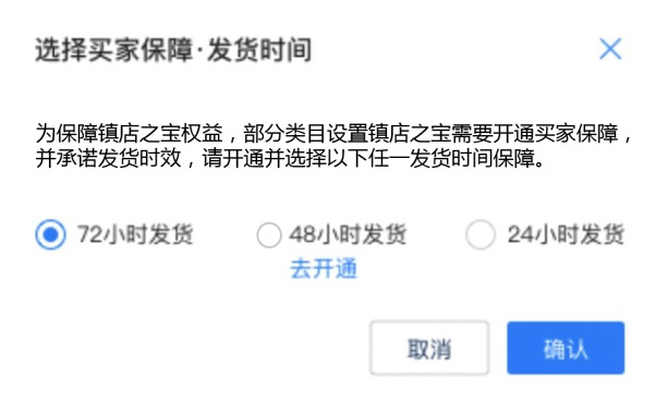 發(fā)貨保障服務(wù),共3檔,分別是24小時、48小時和72小時;
