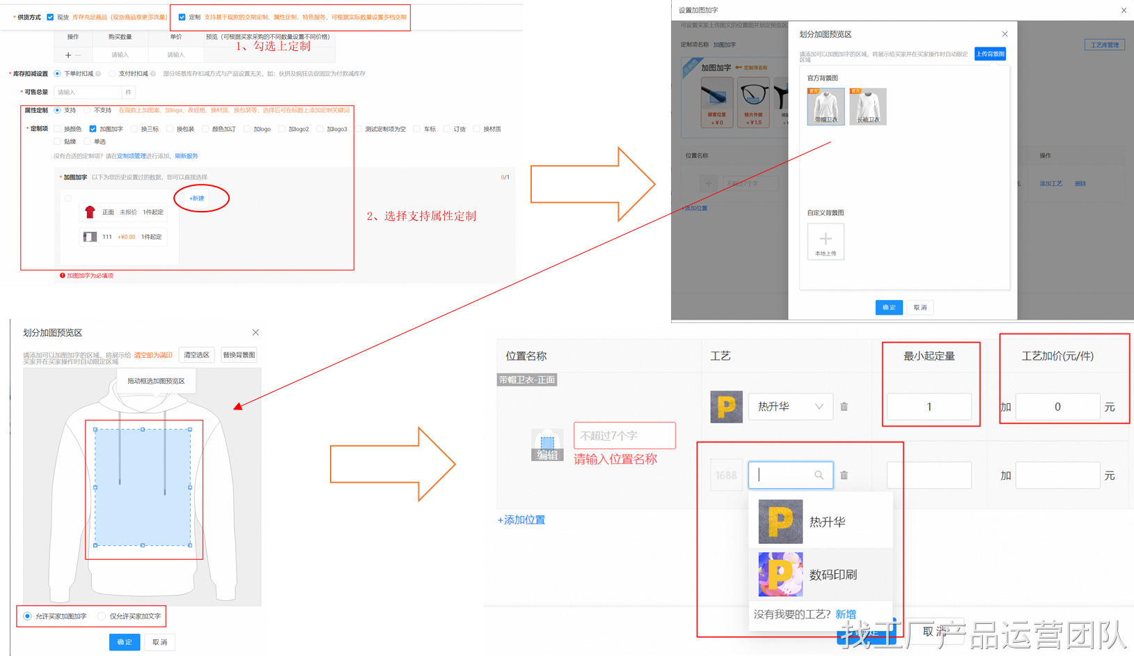 基于商家能做的定制服務,通過在發(fā)布商品(現(xiàn)貨支持定制or純定制商品)在屬性定制設置能支持的定制項;最終通過商品前臺進行表達: