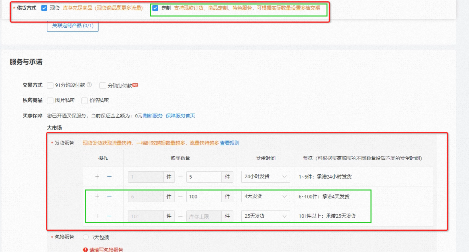第二步:合理規(guī)范設(shè)置商品定制/現(xiàn)貨品屬性,確??梢栽诔兄Z的發(fā)貨時效內(nèi)規(guī)范發(fā)貨。